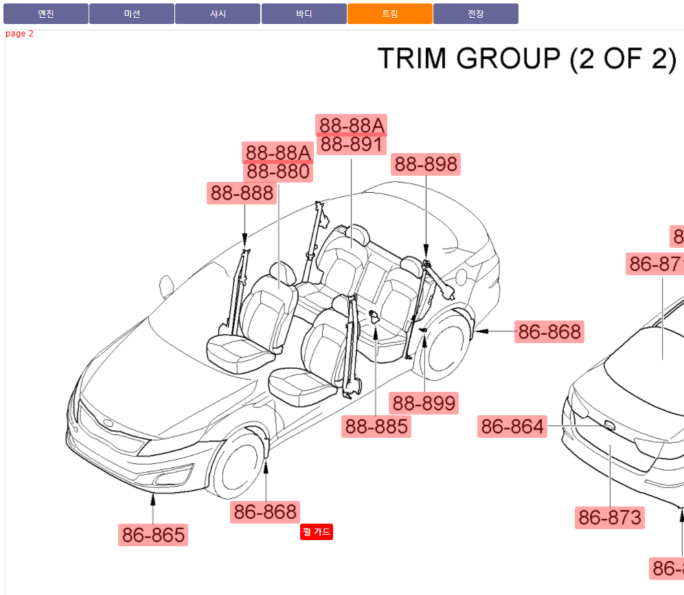 엔진, 미션, 샤시, 바디, 트림, 전장으로 카테고리가 분류되어 있는데, 하나씩 눌러보다보면 내가 원하는 부품이 어디있는지 찾을 수 있다.